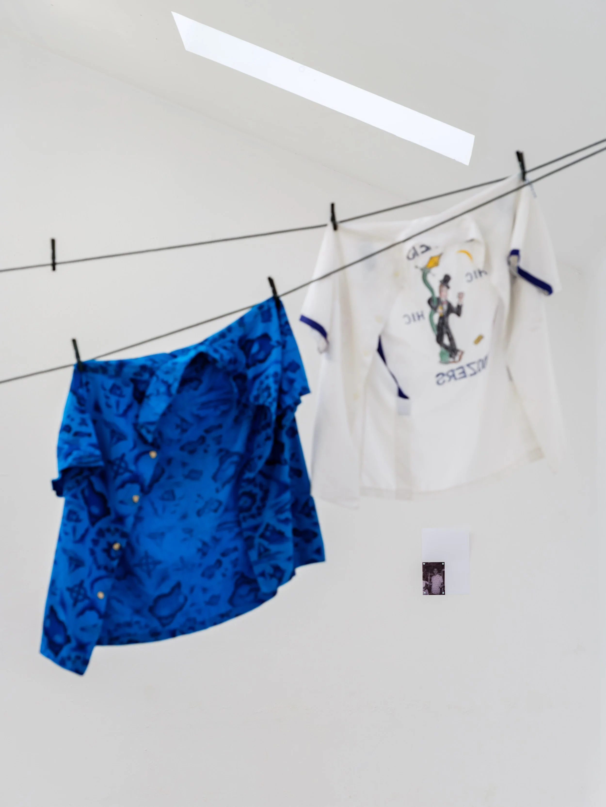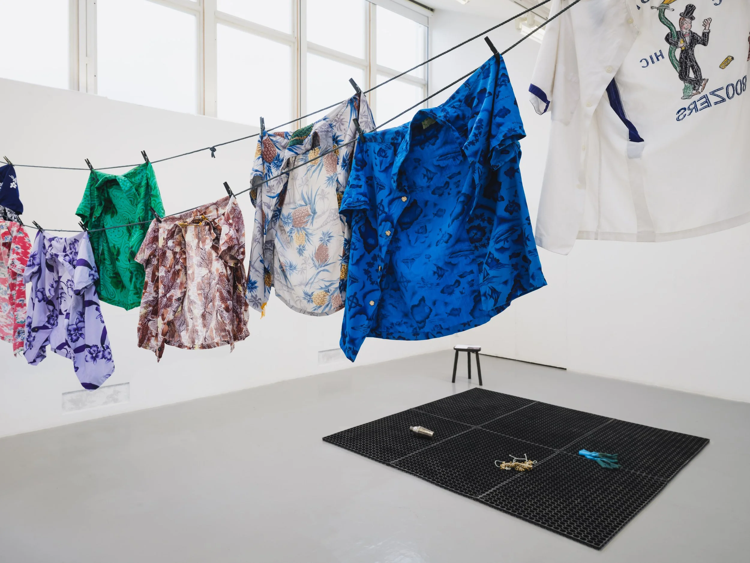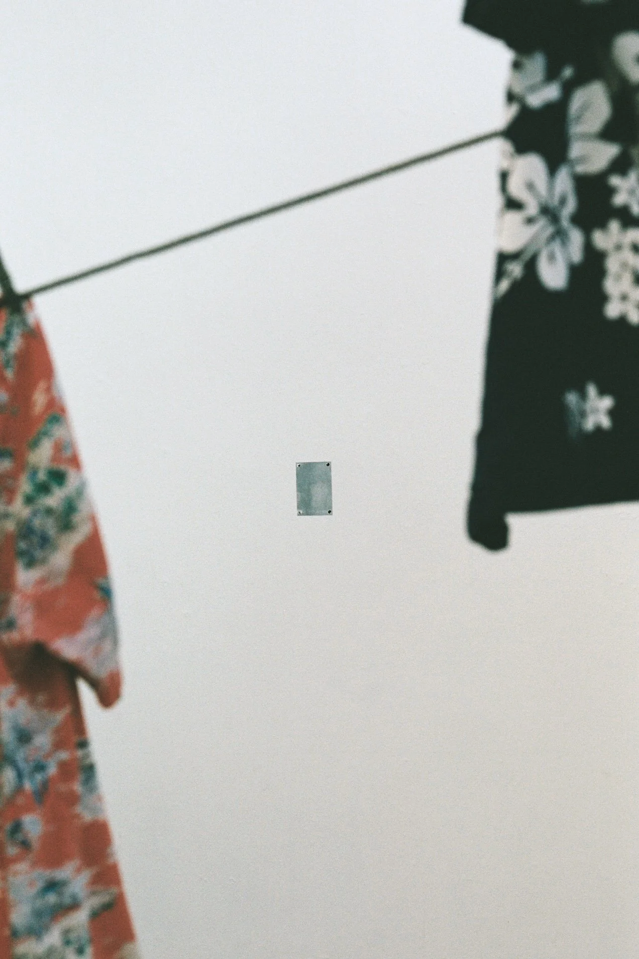 When you enter, after ignoring the stack of press releases, you are met with a white void and a clothesline cutting the room in half, a rubber mat acting as a de facto stage. At the far end of the wall you see what you think to be a print of the image on the invitation, but as you brush past the aloha shirts hanging from the clothesline and draw closer, you notice that the face is distorted, aged—a simulacrum, someone other than the 23-year-old Neil Bhat you saw on the invitational image.