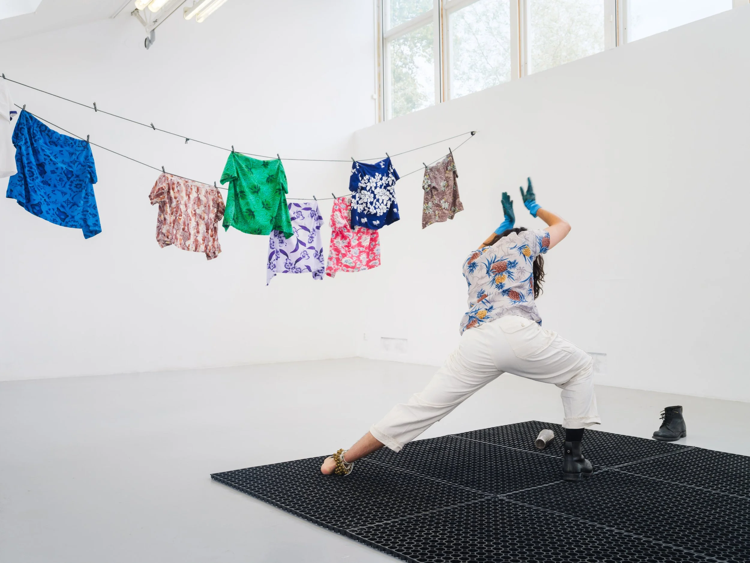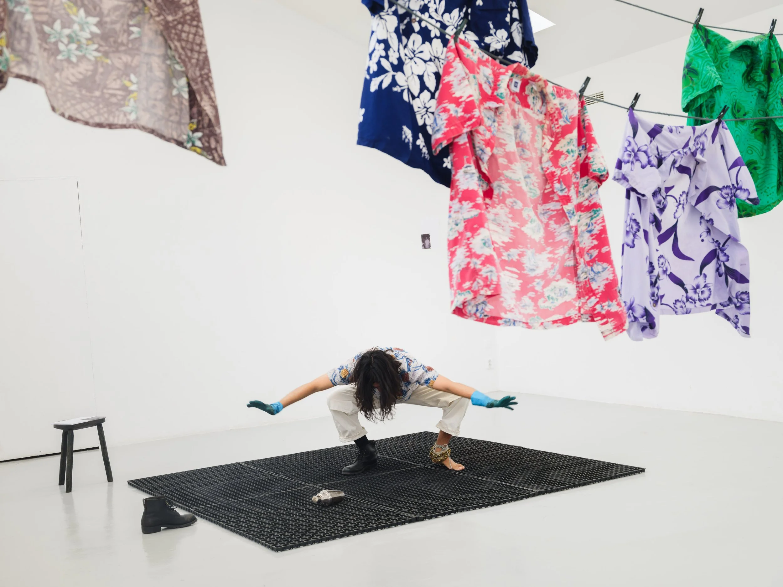 I enter the room from backstage wearing one of the nine aloha shirts from the installation Knot (2025), circle the installation Rubber Bar Mats for Joint and Ligament Relief (2025) counterclockwise several times to find the day’s rhythm and tempo, take off one shoe (either left or right) at the edge of the mat, and then enter the stage. Once on the stage, I tie the brass gunghroo to the ankle without the shoe, and then choose to work with either the rubber gloves (one hand clapping) or the cocktail shaker (the urn). If I have chosen the rubber gloves, one of the sounds I will use in the performance will be clapping—sticky rubber against sticky rubber. If I have chosen the cocktail shaker, I will tap the silver lid against the body of the shaker. I do not know which object I will work with until the moment I pick it up.