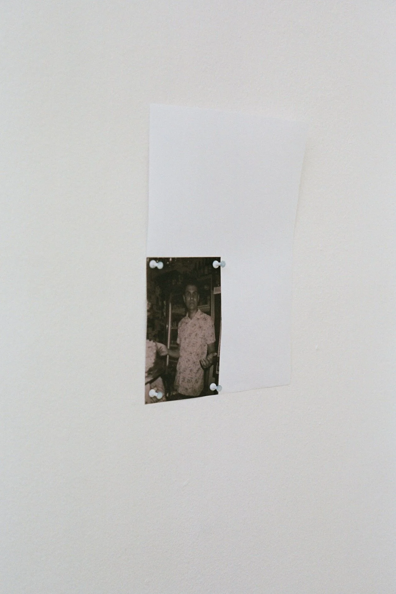 For you, it actually all started weeks before entering the room. The sole purpose of the invitational image (traversing social media, email, and the Royal Institute’s website) was to imprint itself on your retinas, the set-up for the punchline on the 26th of September. It was a grainy black-and-white image of me working behind the counter at Monks American Bar in 2017: a faraway look in my eyes, a receipt in my hand, and an aloha shirt on my shoulders. For me, the image was a memento, a memory, and a fear all packed into one—the fear of succumbing to a night job, the metaphysical anxiety of another self haunting me from the future. For you, it was the beginning of an expectation that would never be met: this particular image of me would never be physically present in the room.
